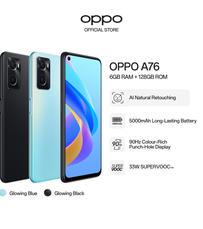 OPPO A76/人像散景相机/90Hz彩色打孔显示器/5000mAh电池/6GB RAM+128 ROM