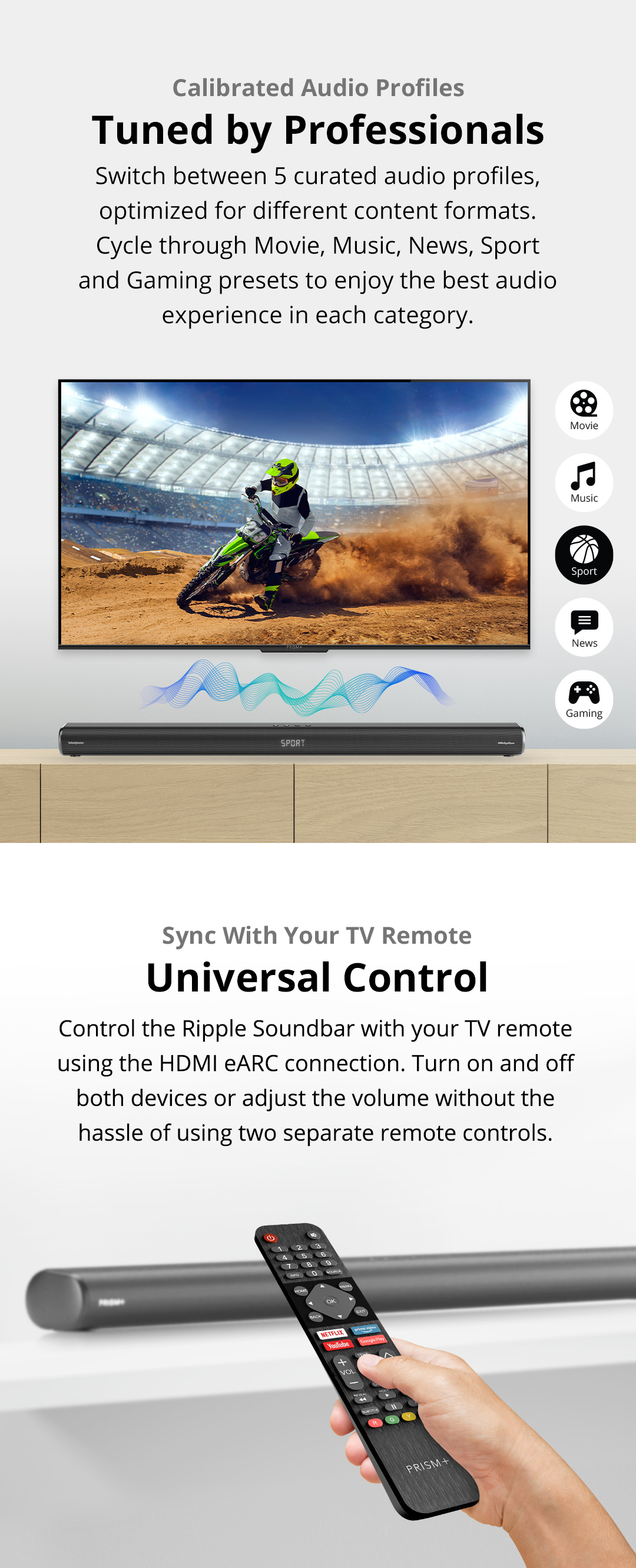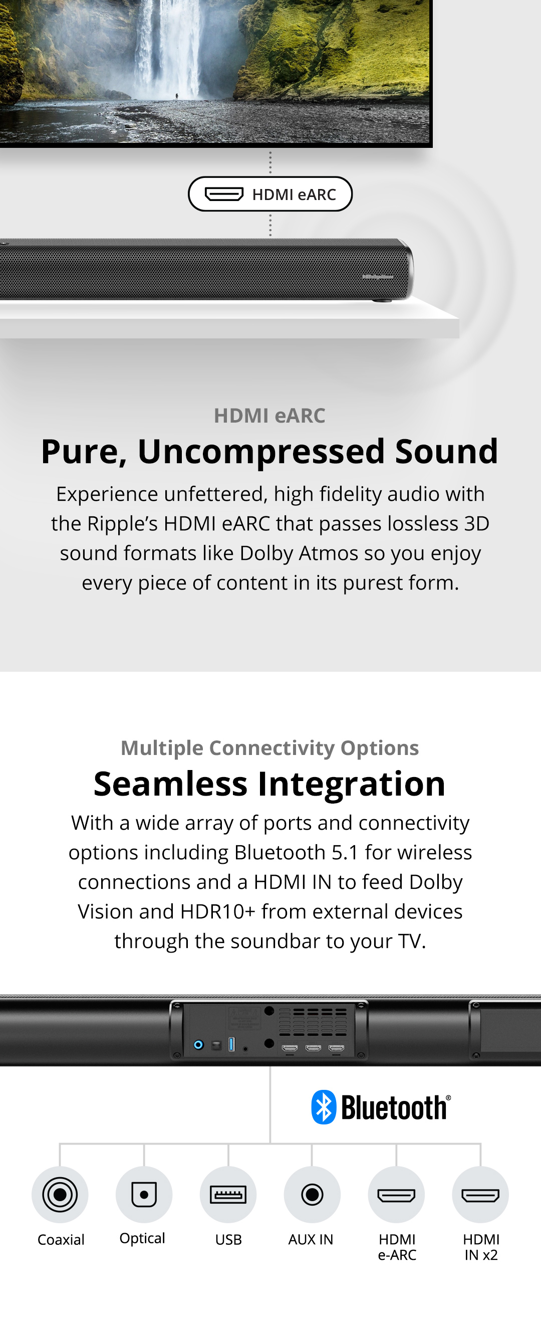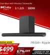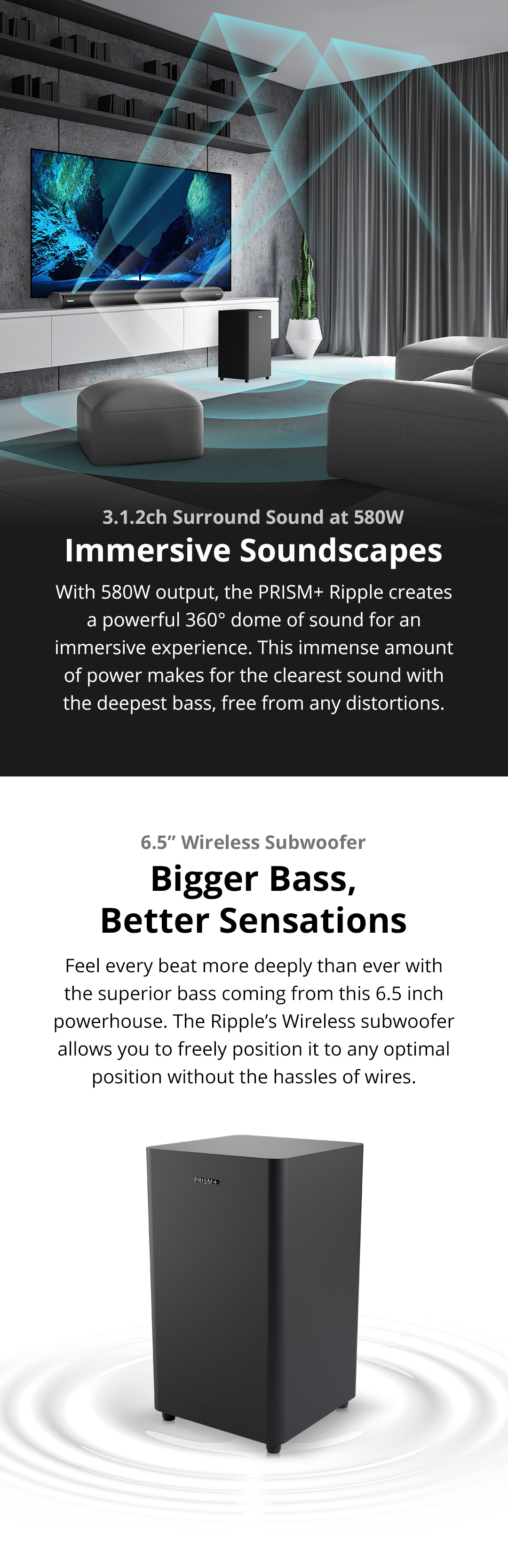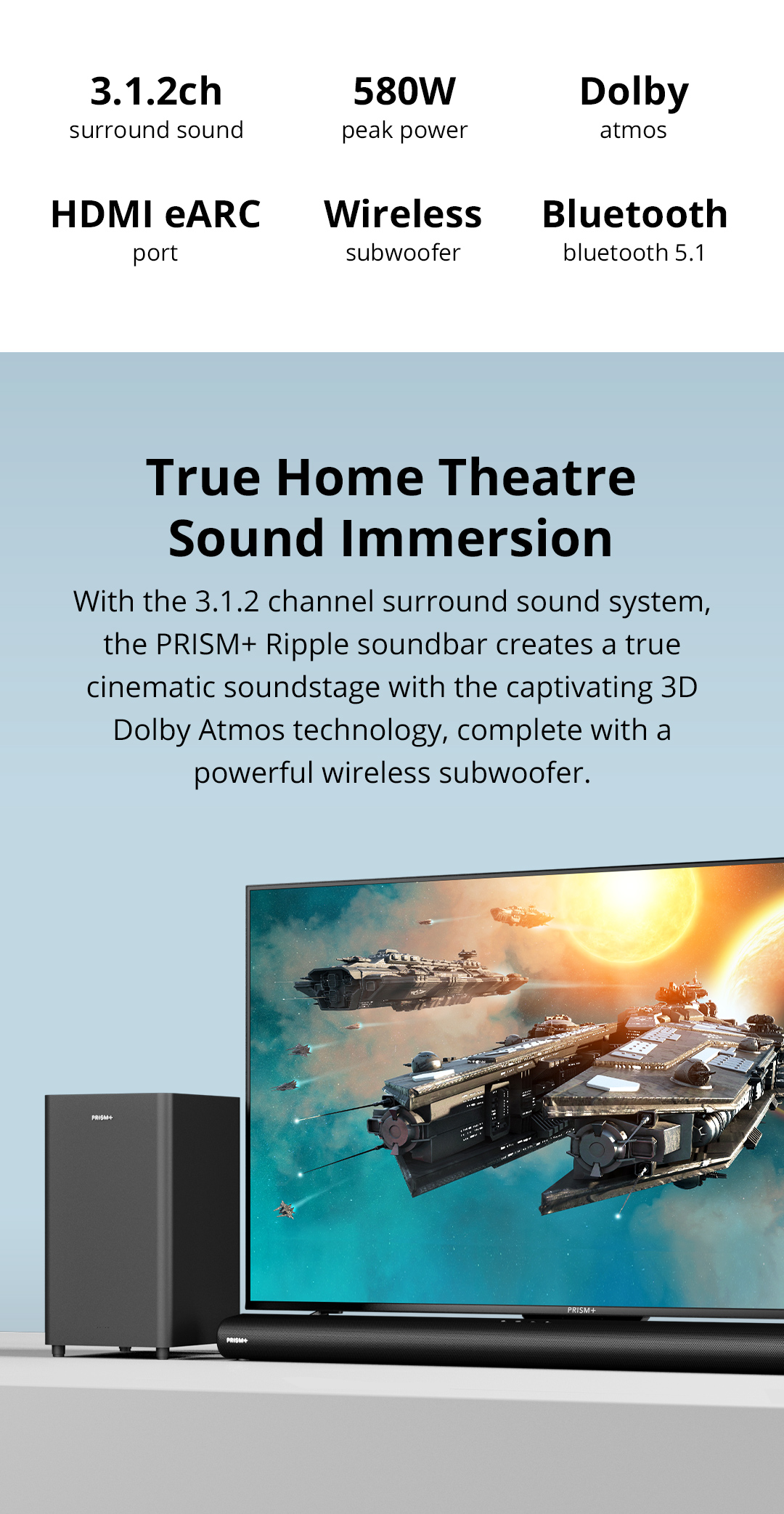 PRISM+Ripple 3.1.2ch带杜比全景声的条形音箱|580W|无线低音炮|无线音乐流|蓝牙5.1